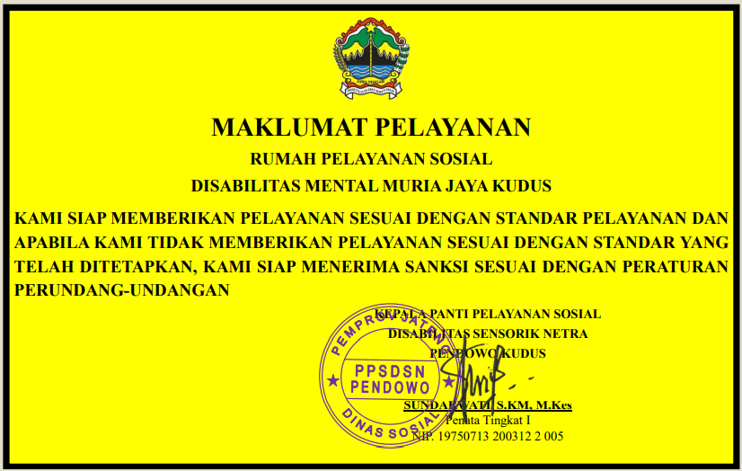 Panti Pelayanan Sosial Disabilitas Sensorik Netra Pendowo Kudus (PPSDSN Pendowo Kudus) mempunyai layanan bagi penyandang disabilitas Mental dengan pelayanan GRATIS (Tidak Dipungut Biaya). Adapun persyaratannya adalah sebagai berikut: